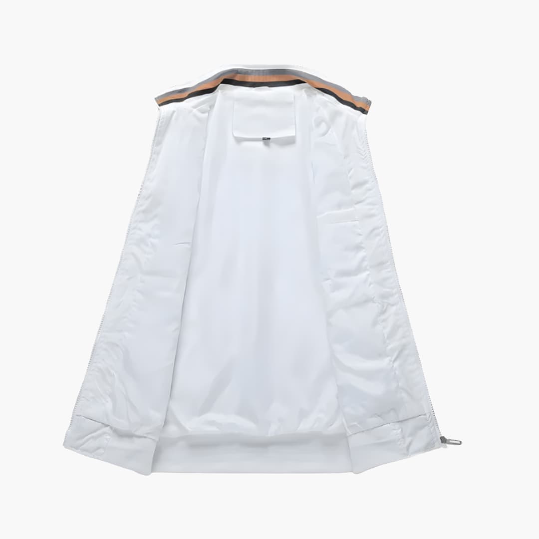 Made from breathable fabric suitable for all-season use. Features include ribbed collar, cuffs and hem, athletic cut, and secure pockets. Designed to be water-resistant, windproof and suitable for casual and active wear.